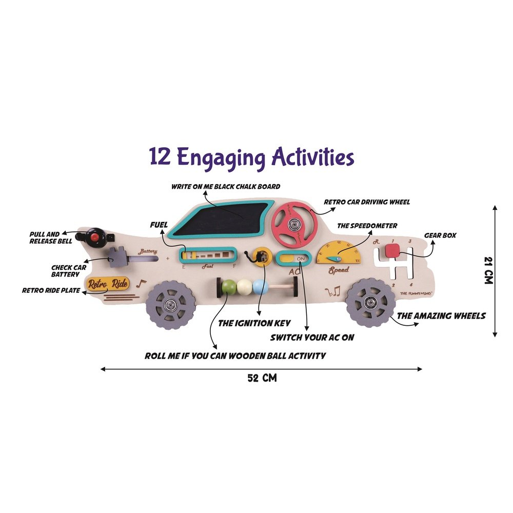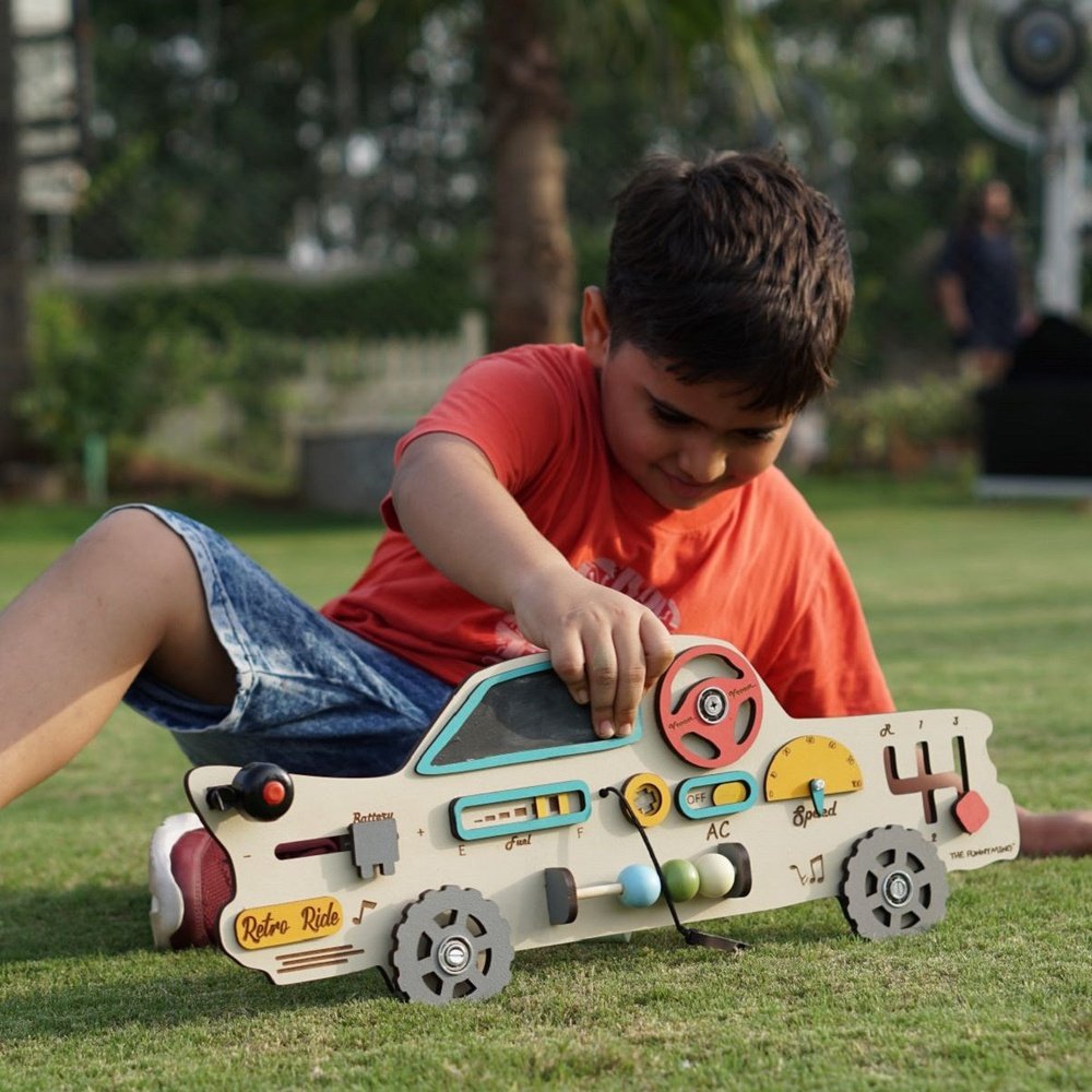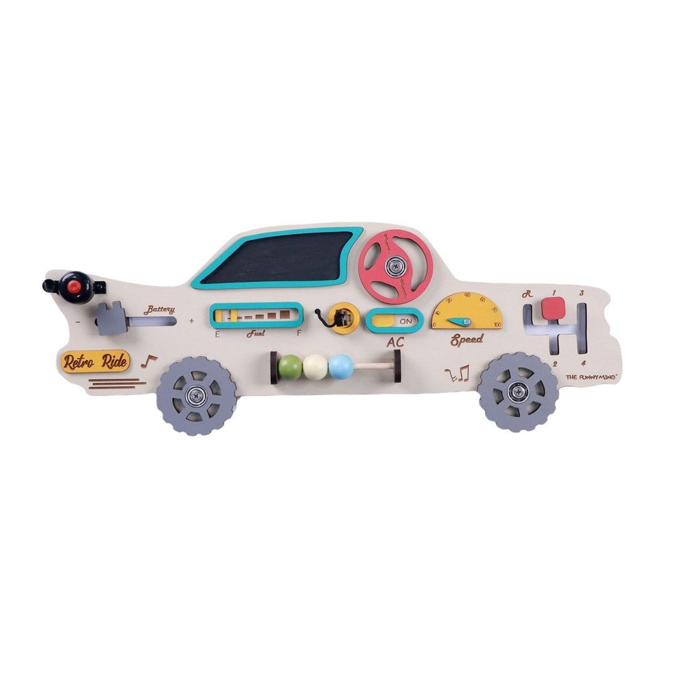 Unique Vintage Car-Themed Busy Board – First-of-its-kind in India by Manifestshop, designed to engage and educate toddlers through interactive play.